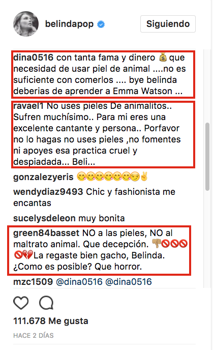 Belinda publicó en su cuenta de Instagram un par de fotografías, las cuales provocaron fuertes críticas en redes sociales, pues sus seguidores aseguraron que en sus dos atuendos, la cantante lució piel de animal.