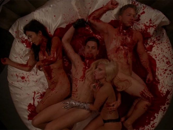 La cantante, quien en la ficción da vida a Elizabeth (una mujer vampiro que transformó su hogar en un hotel donde asesina a sus huéspedes) protagonizó una fuerte escena de sexo, junto a su amante Matt Bomer, en nuna orgía que culmina de una manera muy sangrienta.