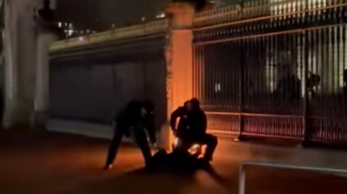 Imágenes difundidas a través de las redes sociales muestran a un hombre provocando un pequeño fuego junto a la puerta justo antes de ser reducido por varios agentes de Scotland Yard, que lo han arrestado.