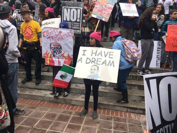 Uno de los manifestantes que se dirigió a los reunidos apoyándose con un megáfono dijo que no era musulmán ni inmigrante indocumentado, pero afirmó tener «roto el corazón» por el temor que generan entre sus amigos las políticas de Trump.