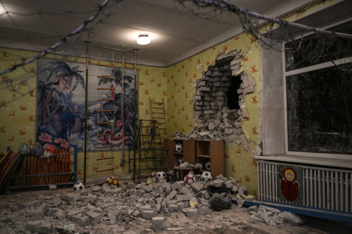 En la sala de deportes de la guardería, una pared está perforada por un proyectil. Los ladrillos que cayeron están ahora entre los juguetes de los niños.