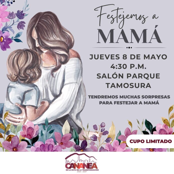 Acompáñanos este jueves 8 de mayo a las 4:30 p.m. en el Salón Parque Tamosura, donde tendremos un evento lleno de sorpresas, alegría y mucho amor para consentir a todas las mamás cananenses.
