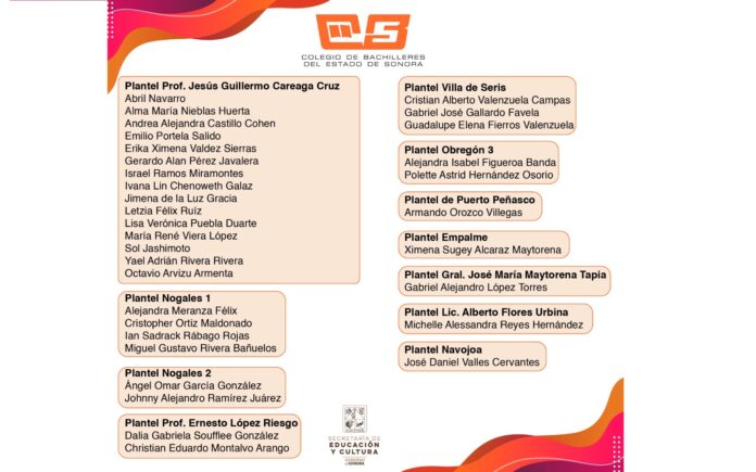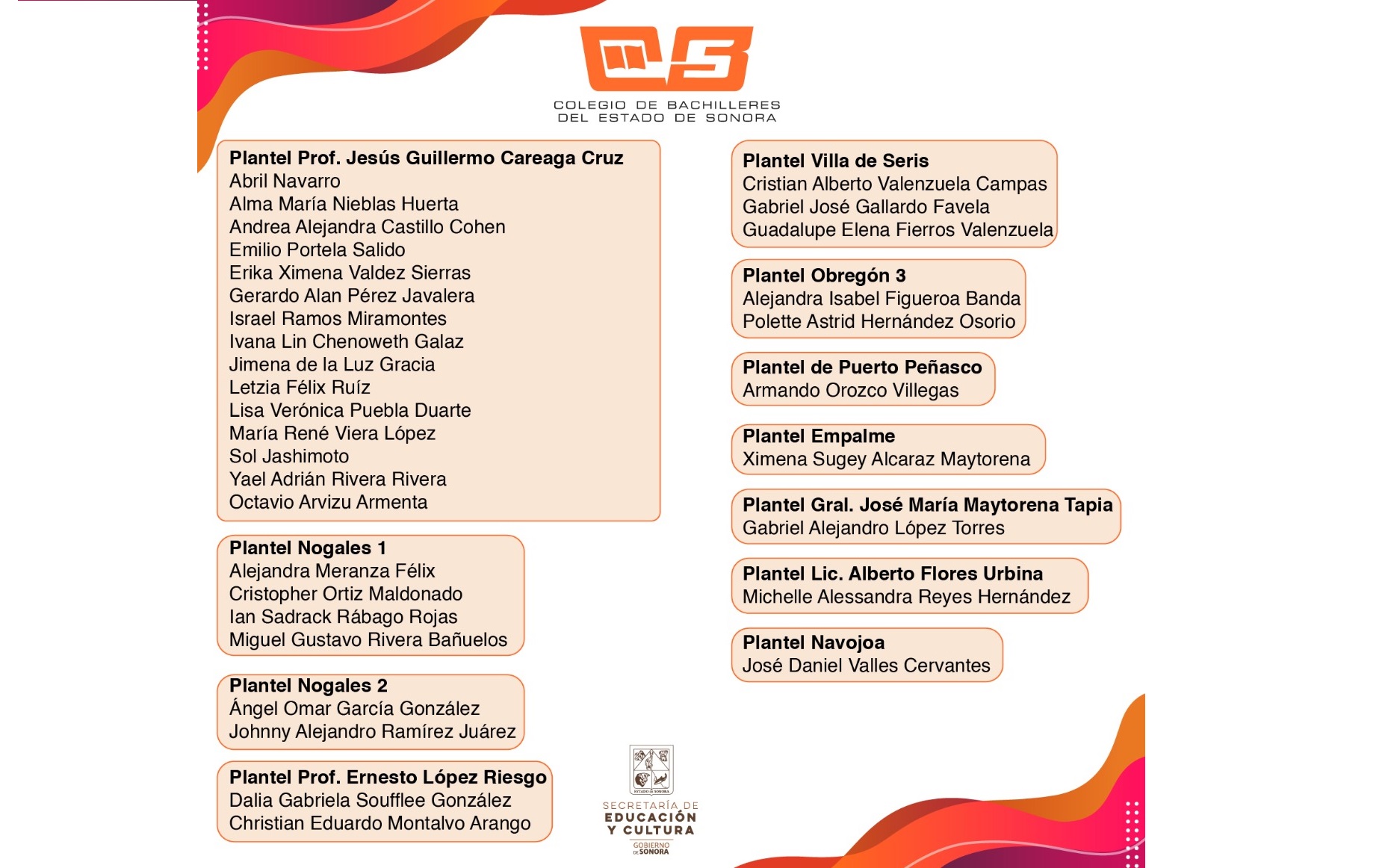 En el preselectivo están 15 alumnos del plantel Profesor Jesús Guillermo Careaga Cruz; cuatro del plantel Nogales 1; tres de Villa de Seris; dos del plantel Profesor Ernesto López Riesgo; dos del Nogales 2 y 2 del plantel Obregón 3; los planteles de Empalme, General José María Maytorena Tapia, Alberto Flores Urbina, de Navojoa y Puerto Peñasco están representados por un alumno cada uno.