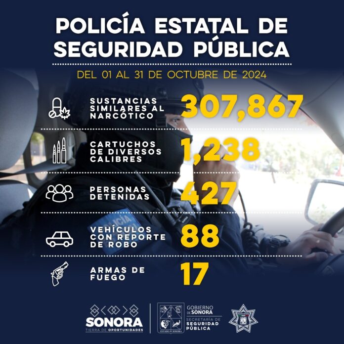 Hermosillo, Sonora; 4 de noviembre de 2024.- Como resultado del trabajo operativo que desplegó la Secretaría de Seguridad Pública (SSP) durante octubre en municipios de Sonora, la Policía Estatal de seguridad Pública (PESP) registró el aseguramiento de 427 personas, además de armas, vehículos y sustancias prohibidas.