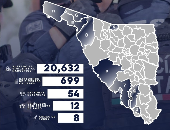| Hermosillo, Sonora; 12 de julio de 2023.- En operativos realizados durante la última semana en la entidad, la Policía Estatal de Seguridad Pública (PESP) dio como resultado la recuperación de vehículos robados, aseguramiento de personas, armas y narcótico. En la semana del 3 al 9 de julio, oficiales de la PESP aseguraron a 54 personas y mantuvieron coordinación con las autoridades de los tres niveles de gobierno, incautando ocho armas de fuego y 669 cartuchos de diferentes calibres. La corporación incautó lo equivalente a 20 mil 632 dosis de sustancias prohibidas y recuperó 12 vehículos con reporte de robo. Los aseguramientos fueron en atención a reportes ciudadanos y patrullajes de vigilancia en Hermosillo, Cajeme, Bácum, Empalme, Guaymas, San Luis Río Colorado, Puerto Peñasco, Nogales, General Plutarco Elías Calles, Benito Juárez, Caborca, entre otros municipios, donde se colabora para el combate y prevención del delito. A través de las acciones de proximidad ciudadana, diariamente invitan a la población a hacer uso de la línea de emergencias 9-1-1 y 089 de denuncia anónima; visitan a estudiantes para ser Promotores de la Paz y participan en labores de prevención del delito en la Jornada Permanente por la Paz. NOTA: Los detenidos se presumen inocentes mientras no se declare su responsabilidad mediante sentencia emitida por el órgano jurisdiccional. (Art. 13 del CNPP). |