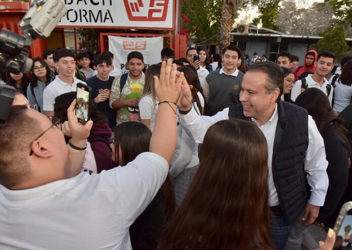El presidente municipal, Antonio Astiazarán Gutiérrez, entregó a estudiantes y a personal docente el tramo 78 del programa Camina Segura en el Cobach Reforma.