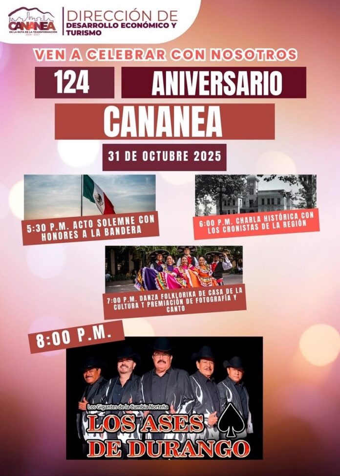 Octubre 2025.- El H. Ayuntamiento de Cananea, a través de la Dirección de Desarrollo Económico y Turismo, te invita a celebrar el 124° Aniversario de la Fundación de Cananea este 31 de octubre de 2025, en el emblemático Centro Histórico “El Ronquillo”.
