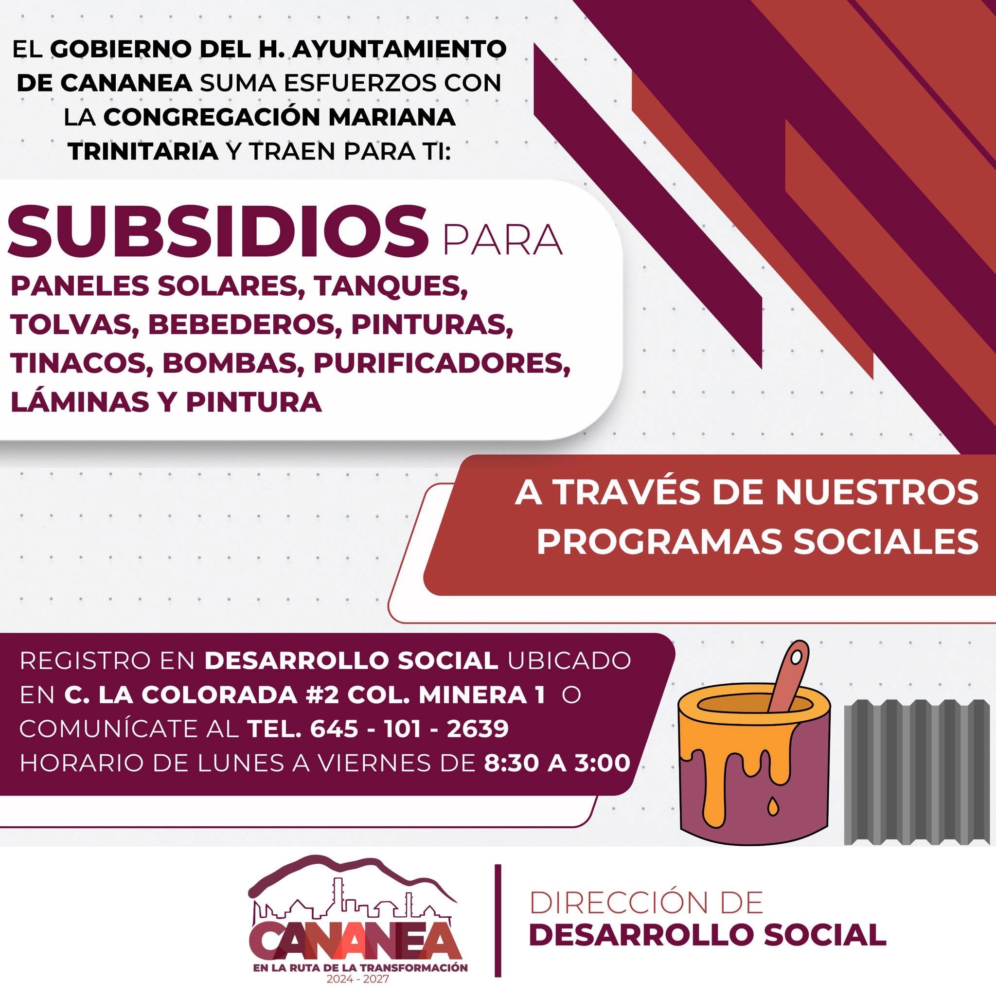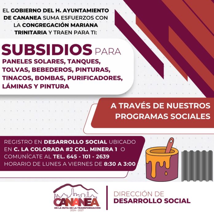 Mayo 2025.- El H. Ayuntamiento de Cananea, en coordinación con la Congregación Mariana Trinitaria, pone a tu alcance subsidios para paneles solares, tinacos, bombas, purificadores, pinturas, láminas, bebederos y más, a través de nuestros programas sociales.