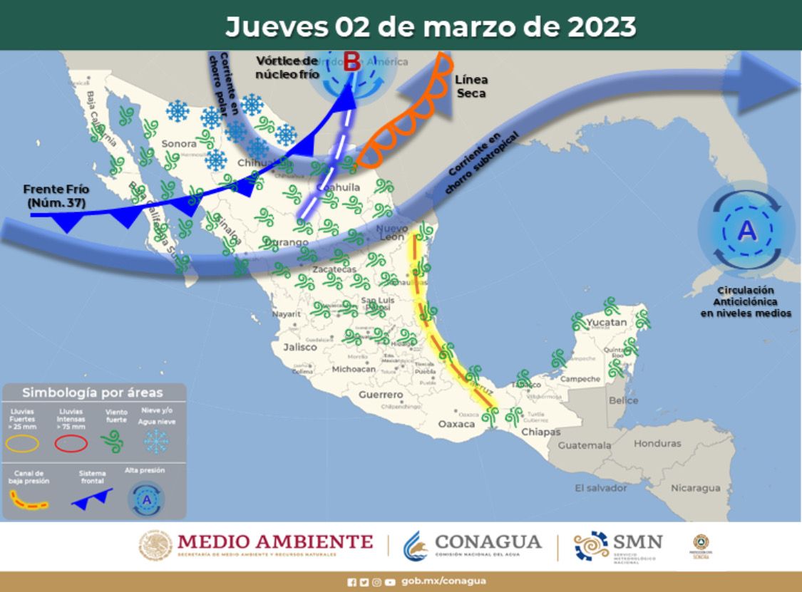 Se espera que mañana miércoles por la tarde ingrese, por el noroeste de Sonora, el frente frío 37, asociado a un vórtice de núcleo frío y la corriente en chorro polar, con probabilidad de lluvias dispersas en los municipios del noroeste, norte, noreste y oriente, así como caída de aguanieve o nieve, en los municipios del norte, noreste y oriente.