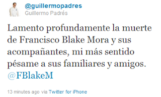 El gobernador del Estado, Guillermo Padrés Elías por medio de su cuenta en Twitter, envió sus más profundas condolencias a las familias de los funcionarios recién fallecidos en el accidente aéreo, entre ellas la del secretario de Gobernación, José Francisco Blake Mora.