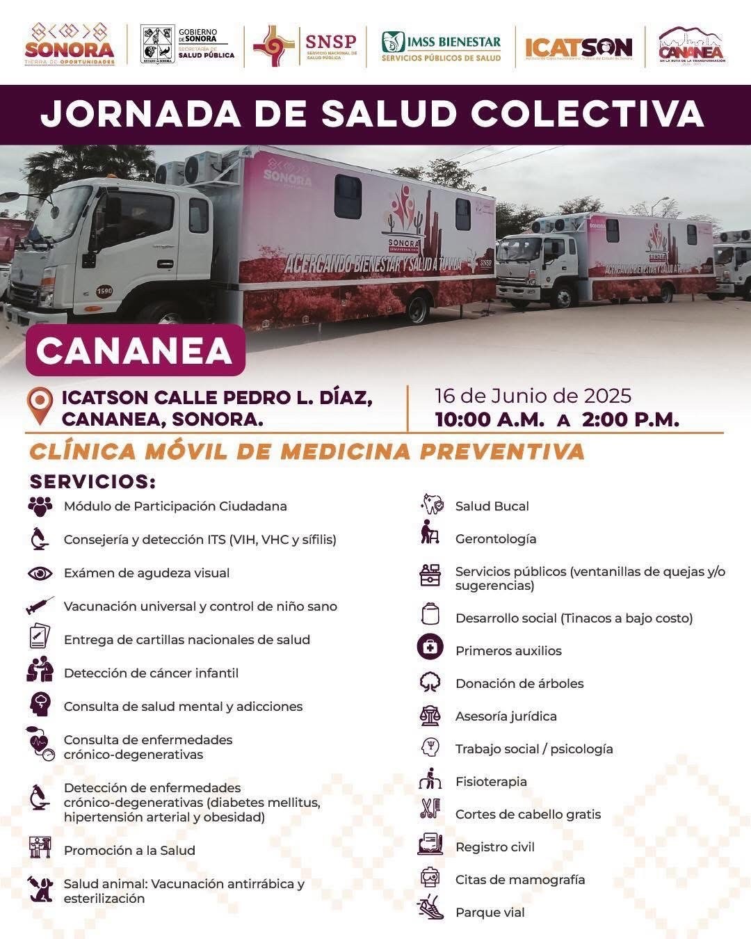 junio 2025.- El Gobierno Municipal de Cananea, en coordinación con diversas instituciones Estatales, invita a la ciudadanía a participar en la Jornada de Salud Colectiva este lunes 16 de junio, en las instalaciones de ICATSON Cananea (Calle Pedro L. Díaz), en un horario de 10:00 a.m. a 2:00 p.m.