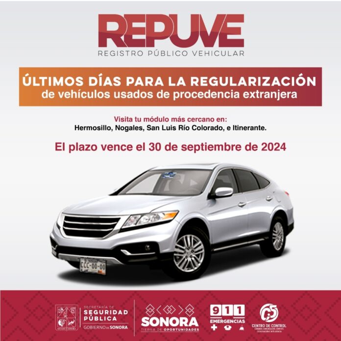 Guaymas, Sonora; 9 de septiembre de 2024.- Un llamado a los sonorenses para que aprovechen los últimos días para la regularización de autos usados de procedencia extranjera, hizo el Registro Público Vehicular (Repuve), dependiente de la Secretaría de Seguridad Pública (SSP).