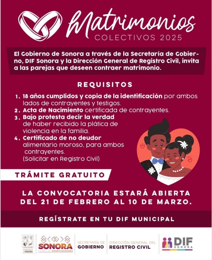 Marzo 2025.- El Gobierno Municipal de Cananea, en coordinación con el Gobierno del Estado y la Dirección General del Registro Civil, invita a todas las parejas a formar parte de los Matrimonios Colectivos 2025.