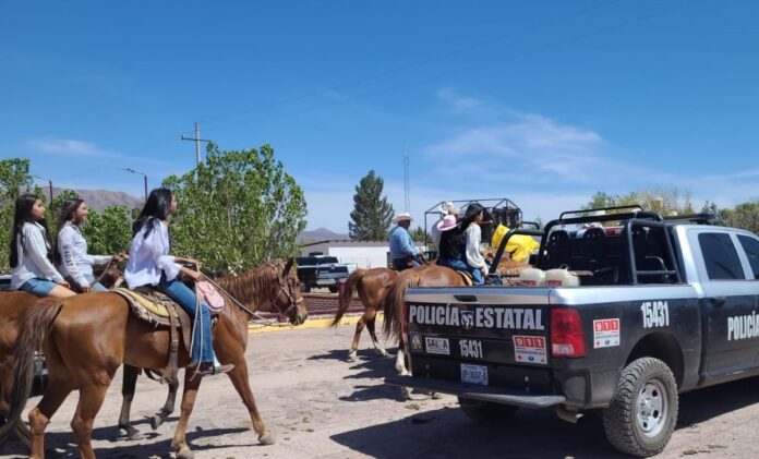 Oficiales de la Policía Estatal de Seguridad Pública (PESP) participaron como parte de las acciones preventivas en las fiestas patronales de San Isidro Labrador, donde se dieron cita varias personas para la cabalgata con destino a la comisaría La Galerita.