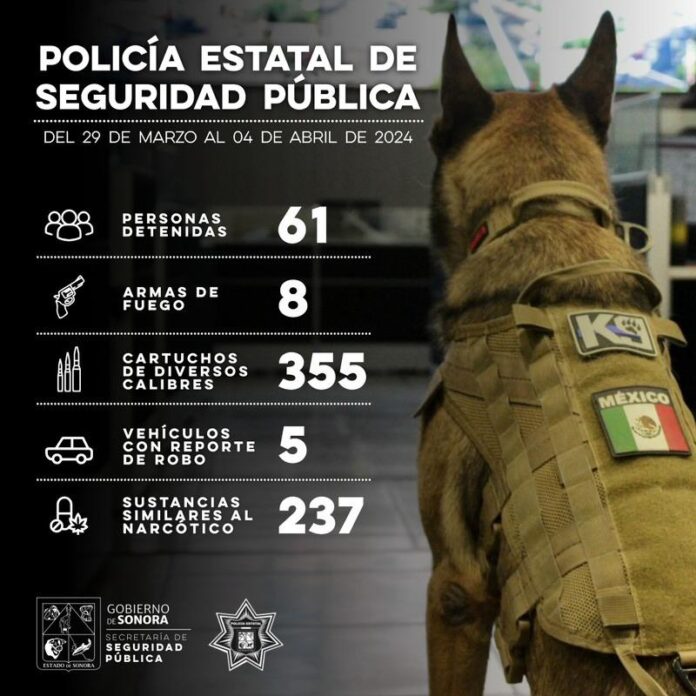 Hermosillo, Sonora; 6 abril de 2024.- En operativos de la última semana, oficiales de la Policía Estatal de Seguridad Pública (PESP), realizaron el aseguramiento de 61 personas por flagrancia delictiva e incautaron sustancias que ponían en riesgo la seguridad ciudadana, así como armas y narcótico.