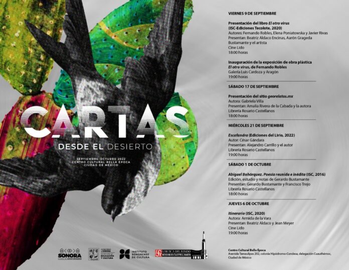Hermosillo, Sonora; 31 de agosto de 2022.- Como parte del programa “Cartas desde el desierto”, Sonora estará presente en la Ciudad de México con la presentación del libro y la exposición “El otro virus” de Fernando Robles, en el foro Cine Lido, al interior del Centro Cultural Bella Época, anunció Aarón Grageda Bustamante.
