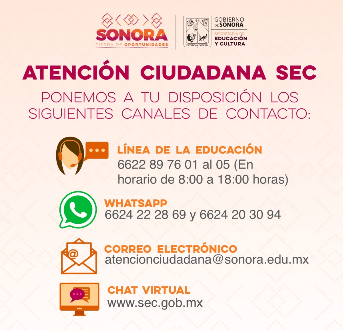 Para atender peticiones y reportes de la comunidad educativa, durante el arranque del ciclo escolar 2023-2024, el Gobierno de Sonora, a través de la Secretaría de Educación y Cultura (SEC), reforzará los mecanismos de atención ciudadana con los que cuenta.