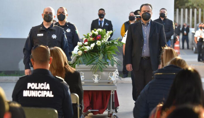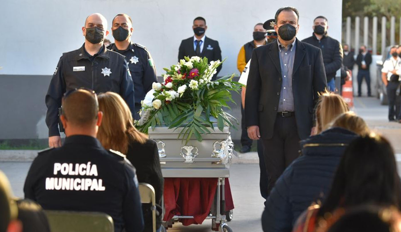<div>Hermosillo, Sonora, 14 de enero de 2022.- El presidente municipal, Antonio Astiazarán Gutiérrez, encabezó la guardia de honor para despedir al policía de tránsito Ramón Armando Ramírez Moreno, quien falleció este jueves por secuelas de un accidente ocurrido en 2020.</div><div><br></div><div>En la ceremonia de cuerpo presente en las instalaciones de la Comandancia Centro, Astiazarán Gutiérrez dio el pésame la esposa del agente, Mayra Olivia Carpio Ibarra; el agente de tránsito murió a los 35 años de edad y dejó también a tres hijas, de 14, 10 y dos años.</div><div><br></div><div>Junto a compañeros, amigos y familiares del homenajeado por su vocación en 10 años de servicio, también estuvieron Manuel Emilio Hoyos, comisario general de la Policía Municipal; Alonso Durón Montaño, comisario en jefe de la corporación; Juan Alberto Salcido Ley, director de la Policía Preventiva; y Francisco Javier Galaviz, director de Tránsito Municipal.</div><div><br></div><div>Los presentes hicieron el último pase de lista, en el que mencionaron con voz fuerte el nombre de su compañero que perdió la batalla después del accidente ocurrido el pasado 29 de junio de 2020, cuando estaba en servicio en su motocicleta, por el bulevar Quiroga y Luis Orcí.</div>