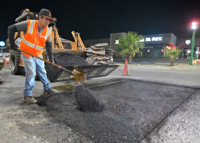Hermosillo, Sonora; 5 de septiembre, 2025.-El Presidente Municipal de Hermosillo, Antonio Astiazarán Gutiérrez, atestiguó acciones de bacheo en jornada nocturna en el bulevar López Portillo, trabajos que forman parte del programa diario de mantenimiento en vialidades principales y accesos a colonias con 15 cuadrillas diurnas y 4 nocturnas.
