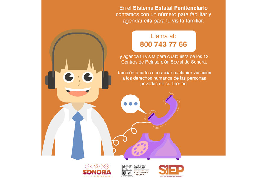 Hermosillo, Sonora; 2 de mayo de 2022. Para agendar visitas familiares en los 13 Centros de Reinserción Social (Cereso) de Sonora, así como recibir quejas y sugerencias, autoridades del Sistema Estatal Penitenciario (SIEP), pusieron en operación la línea 800 743 77 66, anunció Nicollino Cangiamilla Enríquez.