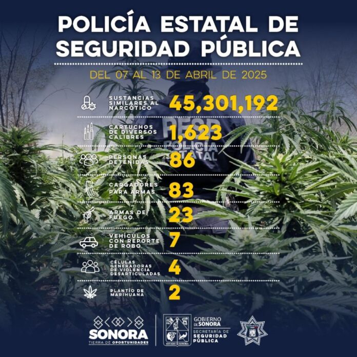 Hermosillo, Sonora; 14 de abril de 2025.- Como parte de la estrategia integral contra el delito, la Secretaría de Seguridad Pública (SSP) llevó a cabo, durante una semana, la destrucción de dos plantíos de hierba verde, la detención de personas en flagrancia delictiva y el aseguramiento de material prohibido.