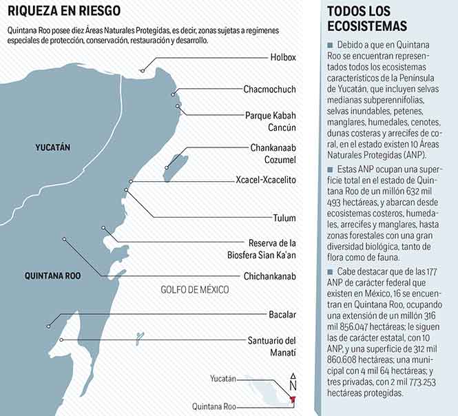 Se descubrió, dijo, que la mayoría de las 10 ANP existentes en Quintana Roo se encuentran en total abandono, mientras que aquellas que han sido concesionadas “ni siquiera presentan reportes de las condiciones en las que se encuentran actualmente”, lamentó el funcionario estatal.