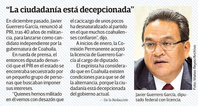 En Coahuila, Fausto Destenave renunció al PRI, donde ocupó varios cargos directivos, y expresó su intención de ser candidato independiente a la alcaldía de Saltillo. Lo mismo hizo el diputado federal Javier Guerrero, pero para lanzarse a la gubernatura.