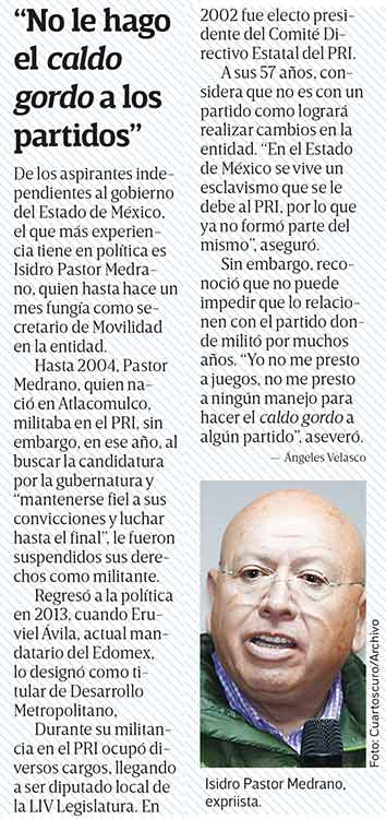 Entre los independientes en el Edomex destaca Isidro Pastor, quien hace unos días renunció a su militancia priista y dejó la Secretaría de Desarrollo Metropolitano.