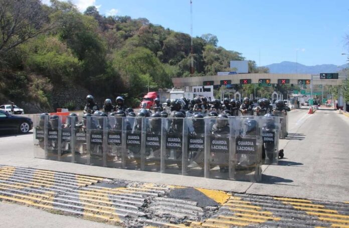 Más de 250 efectivos de la policía antimotines de Guerrero y de la Guardia Nacional fueron desplegado en la caseta de La Venta, ante la llegada de normalistas al puerto de Acapulco.