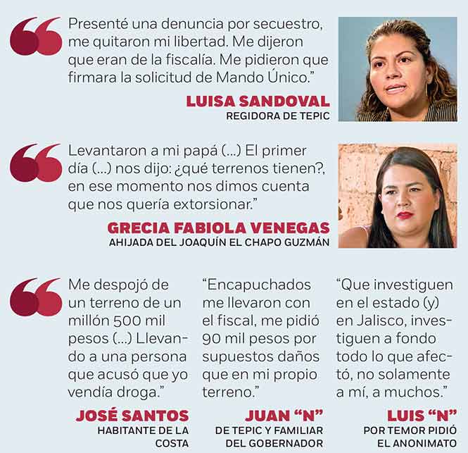 Campesinos, regidores, comerciantes, empresarios, choferes e incluso familiares del gobernador Roberto Sandoval Castañeda, forman parte de la lista de personas que son víctimas de un fiscal que se apoyó de autoridades de los tres niveles de gobierno para incrementar su fortuna a través del despojo de propiedades de familias enteras.