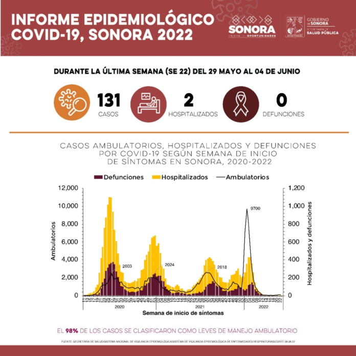 Hermosillo Sonora; 6 de junio de 2022.- La Secretaría de Salud de Sonora (SSA) confirmó que ocurrieron 131 casos y ninguna defunción por Covid-19 en la semana epidemiológica 22, que abarca del 29 de mayo al 4 de junio. La dependencia estatal detalló que los casos se distribuyen de la siguiente manera: Hermosillo (82), Cajeme (27), Nogales y San Luis Río Colorado (cinco cada uno); Guaymas (cuatro), Empalme (dos), Suaqui Grande, Álamos, Altar, Huatabampo, Navojoa y Puerto Peñasco (uno cada uno).Estos nuevos casos son derechohabientes del IMSS (59), Isssteson (53), SSA (16); e Issste (tres)La SSA detalló que, durante toda la pandemia en Sonora, de 2020 a 2022, se han acumulado 165 mil 491 casos confirmados por Covid-19 y 10 mil 138 defunciones por el virus; esta información es preliminar. La institución de Salud continúa reiterando el llamado a mantener las medidas preventivas contra el Covid-19 como son el uso correcto de cubreboca, lavado frecuente de manos y mantener la sana distancia. |