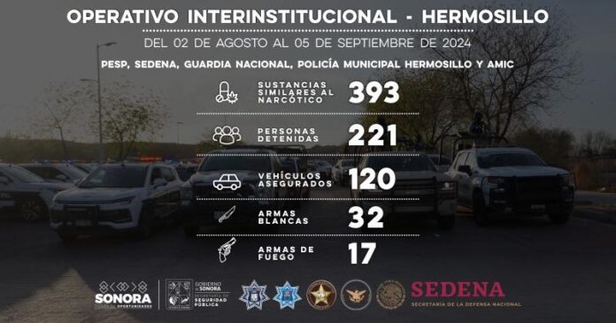 Desde al día 2 de agosto a la fecha, incautaron 17 armas de fuego, 32 armas blancas, alrededor de 100 vehículos asegurados por conducción de personas en estado de ebriedad y 20 motocicletas por infracción en la capital sonorense.